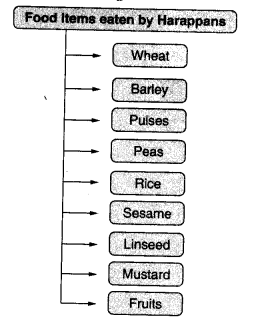 Answer: (1) Harappans grew wheat, barley, pulses, peas, rice, sesame, linseed and mustard. A new tool called plough was used to dig earth for turning the soil and planting seeds. Due to little rainfall, a method of irrigation was probably used.