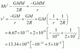 Q20 :Two stars each of one solar mass (= 2 x 1030 kg) are approaching each other for a head on collision. When they are a distance 109 km, their speeds are negligible. What is the speed with which they collide? The radius of each star is 104 km. Assume the stars to remain undistorted until they collide. (Use the known value of G).