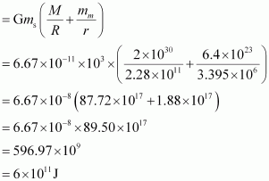 Q24 :A spaceship is stationed on Mars. How much energy must be expended on the spaceship to launch it out of the solar system? Mass of the space ship = 1000 kg; mass of the Sun = 2 x 1030 kg; mass of mars = 6.4 x 1023 kg; radius of mars = 3395 km; radius of the orbit of mars = 2.28 x 108kg; G= 6.67 x 10-11 m2kg-2.