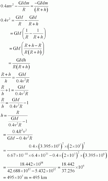 Q25 :A rocket is fired ‘vertically’ from the surface of mars with a speed of 2 km s-1. If 20% of its initial energy is lost due to Martian atmospheric resistance, how far will the rocket go from the surface of mars before returning to it? Mass of mars = 6.4 x 1023 kg; radius of mars = 3395 km; G = 6.67 x 10-11 N m2 kg-2.