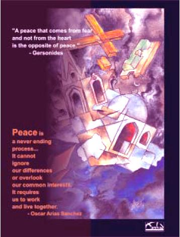 The given quote from Oscar Arias Sanchez highlights the need for peace as a mutual process that “requires us to work and live together”. As Gersonides states, peace cannot be achieved by force or fear but by shared consent. The sentences in the poster are trying to convey how peace is not an outcome of a definitive stance, but rather it is a process where similarities and differences conglomerate to form a whole. Attainment of peace does not entail turning a blind eye to racial, religious or economic differences, but rather accepting these as they are but not allowing these differences to mould our thoughts towards ill-will or hatred for those who are different from us in their religious undertakings.