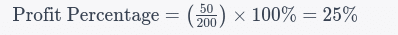 For example, if you have a profit of $50 on an item with a cost price of $200, the profit percentage would be: